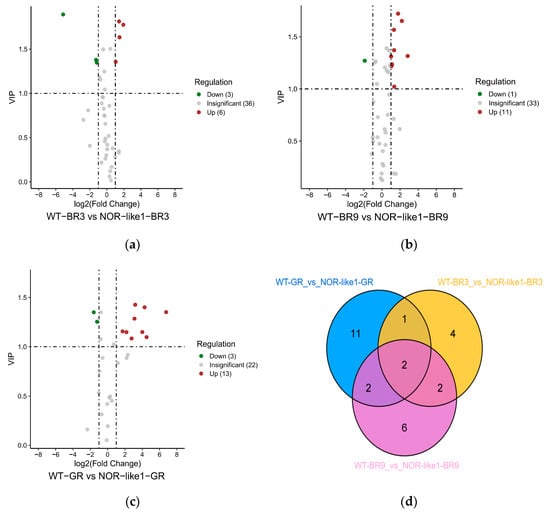 Analysis of differential metabolites between WT and NOR-like1 tomato fruits at the same ripening stage: (a–c) The volcano plot shows the expression levels of the differential metabolites among WT-BR3 vs. NOR-like1-BR3, WT-BR9 vs. NOR-like1-BR9, and WT-GR vs. NOR-like1-GR, respectively. (d) The Venn diagram shows the differential metabolites between WT and NOR-like1 tomato fruits at the same ripening stage.