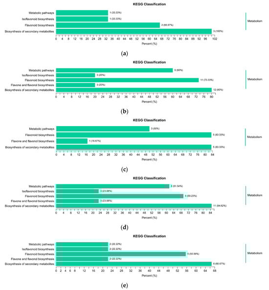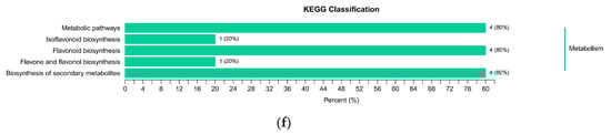 The results of further KEGG enrichment analysis are shown in Figure 9a–f. It is revealed that the significant enrichment of the differential flavonoid metabolites was distributed in the following pathways: flavonoid biosynthesis, flavone and flavonol biosynthesis, the biosynthesis of secondary metabolites, metabolic pathways, and isoflavonoid biosynthesis. The most enriched pathway was the ‘biosynthesis of secondary metabolites’. This was followed by ‘flavonoid biosynthesis’.