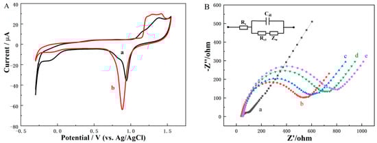(A) CV curves of the bare SPGE before (a) and after (b) activation by electrochemistry in 0.5 M H2SO4. (B) EIS curves at different modification stages: (a) bare SPGE, (b) DNP/SPGE, (c) mAbs/DNP/SPGE, (d) mAbs/BSA/DNP/SPGE, (e) mAbs/BSA/DNP/SPGE reacted with 1 ng/mL AFB1; the working solution was 5 mM [Fe(CN)6]3−/4− with 0.1 M KCl.