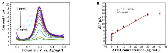 (A) DPV responses of the Ec iPOCT biosensor for different concentrations of AFB1 (0 pg/mL, 0.04 pg/mL, 0.2 pg/mL, 0.6 pg/mL, 2 pg/mL, 6 pg/mL, 10 pg/mL, 0.1 ng/mL, 1 ng/mL, 5 ng/mL, 10 ng/mL, 20 ng/mL, 30 ng/mL, 40 ng/mL); (B) corresponding calibration curve (n = 3).