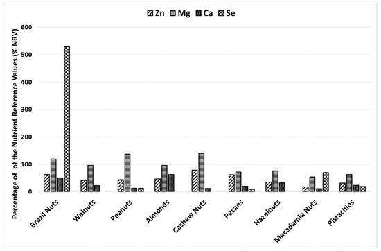 Edible nuts can be considered a natural source of macro- and micro-elements according to the recommended daily allowance (RDA), the value estimation of the Index of Nutritional Quality (INQ) (Table 2), and the nutrient reference value (NRV) (Figure 2). All the tested nuts, except for macadamia nuts, cover over 15% of the NRV and are sources of Zn (according to EU regulation). These products can supplement Zn deficiencies in the diet (INQ value: 1.5–3.9) and provide between 12% (pistachios) and 41% (cashew nuts) of the RDA for Zn in a recommended portion (42 g). All the tested nuts are good sources of Mg, and the consumption of a recommended portion fulfills from 20% (macadamia nuts) to 68–69% (peanuts and cashews) of the RDA. INQ values for Mg are above 1 (ranging from 2.0 to 6.7) (Table 2). All the tested nuts cover over 15% of the NRV and are a source of Mg (according to EU regulation).