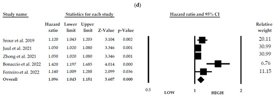 UPFs, depending on the product, have different size effects on the risk of NCDs. However, a 10% increase in the consumption of UPFs per day is associated with an increased risk of obesity (HR = 1.068; 95% CI = 1.018–1.121; I2 = 87.574; p-value = 0.007), diabetes (HR = 1.115; 95% CI = 1.071–1.161; I2 = 22.971; p-value = 0.000), cancer (HR = 1.021, 95% CI = 1.002–1.040; I2 = 67.745; p-value = 0.032), and cardiovascular disease (HR = 1.096; 95% CI = 1.043–1.151; I2 = 74.482; p-value = 0.001). Increased risk is associated with increased UPF consumption for premenopausal breast cancer (HR = 1.015; 95% CI = 0.952–1.083) and postmenopausal breast cancer (HR = 1.052; 95% CI = 0.935–1.184). Notably, obesity parameters exhibit a higher heterogeneity in NCD risk association than the other parameters studied here. Thus, significant differences in results may be expected among studies analyzing obesity and NCD risk. In contrast, the diabetes group showed the lowest heterogeneity in association with NCD risk. A forest plot is presented in Figure 3.