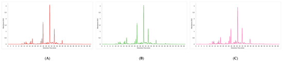 Chromatograms of phenolic compounds (HPLC-DAD) at 320 nm for CE (A), UAE (B) and MAE (C) extraction. Peaks: 1: 2,5-Dihydroxybenzoic acid; 2: 3-O-caffeoylquinic acid; 3: 5-O-caffeoylquinic acid; 4: 4-O-caffeoylquinic acid; 5: caffeic acid; 6: 1,5-Di-O-caffeoylquinic acid; 7: ferulic Acid; 8: luteolin-7-O-glucoside; 9: luteolin derivative; 10: 4,5-Di-O-caffeoylquinic acid; 11: apigenin-7-O-glucoside; 12: apigenin derivative; 13: quercetin-3-O-glucoside; 14: rosmarinic Acid; 15: salvianolic acid B: lithospermic acid.