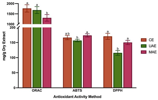 Antioxidant activity of LP extracts by ORAC method (expressed as mg TE/g DE), ABTS method (expressed as mg AAE/g DE) and DPPH method (expressed as mg TE/g DE). Values are represented by the average ± standard deviation. Different letters (a,b) mean significant differences between extraction methods (p < 0.05).