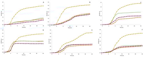 Growth inhibition curves by optical densities (at 625 nm) of Bacillus cereus (A), Listeria monocytogens (B), Staphylococcus aureus (C), Escherichia coli (D), Pseudomonas aeruginosa (E) and Salmonella enterica (F) when incubated with different LP polyphenol-rich extracts extracted based on CE (▲, in orange), UAE (✖, in green) and MAE (◼, in pink) at 10 mg/mL and positive control (●, in yellow).