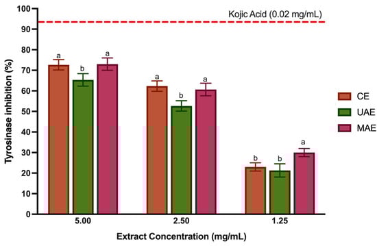 The capability of LP extracts to inhibit tyrosinase enzyme was assessed with a colorimetric tyrosinase inhibitor screening kit ( ab204715, Abcam). Briefly, a mixture of extracts previously diluted in the buffer (20 µL) and tyrosinase solution (50 µL) was incubated in a 96-well microplate at 25 °C for 10 min. Then, 30 μL of substrate solution was added, and the absorbance was continuously read at 510 nm in a microplate reader (Synergy H1; BioTek Instruments, Winooski, VT, USA). Data were recorded every 2 min time interval for 30 min. An inhibition control (IC) was performed with Kojic acid (0.021 mg/mL). A positive control for the enzyme was performed with a mixture of enzyme and substrate in the presence of buffer. The average was made for reading duplicates. Two time points (T1 and T2) were chosen in the linear range of the plot and obtained the corresponding values for absorbance (A1 and A2). The slope was calculated for all samples (S), inhibition control (IC) and enzyme control (EC) by dividing the net ΔA (A2 − A1) values with the time ΔT (T2 − T1). The percentage inhibition was calculated using Equation (4):