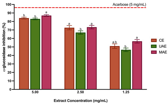 The α-glucosidase inhibition was determined using a colorimetric-based method according to Know et al. [23]. Firstly, the dry extracts were dissolved and diluted in the phosphate buffer (pH 6.9; 0.1 M), and the final concentrations tested were between 5.0 and 1.25 mg/mL. A total of 50 µL of extract solution and 100 µL of phosphate buffer (pH 6.9; 0.1 M) containing α-glucosidase (1.0 U/mL) were incubated in 96-well plate at 25 °C during 10 min. After that, 50 µL of a 5 mM p-nitrophenyl-α-D-glucopyranoside solution prepared in phosphate buffer (pH 6.9; 0.1 M) was added to each well with a multichannel pipettor and the absorbance was read. The plate was incubated at 25 °C for 5 min, and absorbance readings were recorded at 405 nm with a microplate reader (Synergy H1, BioTek Instruments, Winooski, VT, USA). As a negative control, 50 μL of buffer solution replaced the extracts. Acarbose was used as a positive control at a 5 mg/mL concentration. A blank without the enzyme (100 μL of 0.1 mol/L phosphate buffer instead) was performed for each sample. The α-Glucosidase inhibitory activity was expressed as inhibition (%) and calculated using Equation (5):
