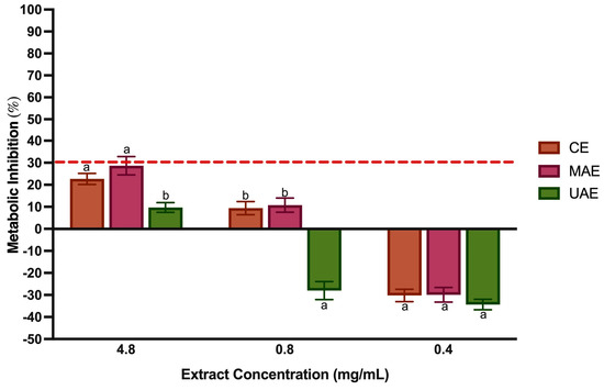 Growth inhibition (%) for each pathogenic microorganism after 24 h exposure to LP polyphenol-rich extracts (CE, UAE, MAE) at different concentrations. Values are represented by the average ± standard deviation. Different letters (a–f) mean significant differences between the concentration tested (p < 0.05).