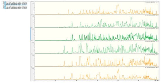 Mobile phases A (2% acetonitrile, pH 10.0) and B (98% acetonitrile, pH 10.0) were used for gradient elution (Table 1 and Table 2). Dissolve the lyophilized powder (200 ng) in solution A and centrifuge at room temperature at 12,000× g for 10 min. Use C18 columns (Waters BEH C18, 4.6 × 250 mm, 5 μm) to fractionate the sample on the Rigol L3000 HPLC system with a column oven set at 45 °C. Monitor the eluates at UV 214 nm, collect 1 tube per minute, and finally combin into 4 or 6 fractions. The chromatogram of the fractions collected was shown in Figure 1. Dry all fractions under a vacuum and reconstruct them in 0.1% (v/v) formic acid (FA) in water.