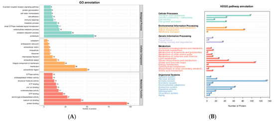 In total, 4870 peptides and 805 proteins were characterized in DM (Table S1). Subcellular localization in DM mainly included extracell protein (243 proteins, 36.32%), plasma membrane protein (102 proteins, 15.25%), cytoplasm protein (74 proteins, 11.06%), lysosome protein (60 proteins, 8.97%), endoplasmic reticulum protein (58 proteins, 8.67%), and nucleus protein (51 proteins, 7.62%). The functions of identified proteins were annotated by GO analysis and metabolic pathway analysis (Figure 2). GO analysis revealed that these proteins were mainly related to biological processes (BP), such as proteolysis, the oxidation-reduction process, and the carbohydrate metabolic process; molecular functions (MF), such as protein binding, calcium ion binding, and serine-type endopeptidase activity; and cellular components (CC), such as extracellular region, membrane, and integral component of membrane. Metabolic pathway analysis suggested that the majority of the donkey proteins were associated with the immune system, global and overview maps, transport and catabolism, signal transduction, the endocrine system, and the digestive system.