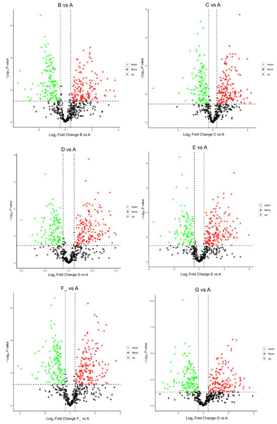 Volcano plots of DEPs in DM in different lactation stages using a data-independent acquisition (DIA)-based proteomics approach. FC = fold change. Note: milk samples were collected from Dezhou donkeys at seven different lactation stages: 1 d (A), 30 d (B), 60 d (C), 90 d (D), 120 d (E), 150 d (F_), and 180 d (G) after foaling.