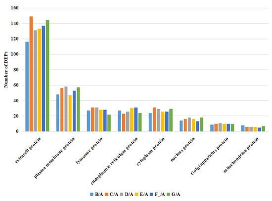 Subcellular localization of DEPs in the milk in different lactation stages. Note: milk samples were collected from Dezhou donkeys at seven different lactation stages: 1 d (A), 30 d (B), 60 d (C), 90 d (D), 120 d (E), 150 d (F_), and 180 d (G) after foaling.