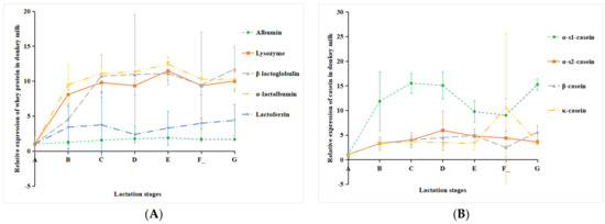 The relative expression of DM proteins (whey protein and casein) in different lactation stages was analyzed. The results showed that whey protein in DM mainly included α-lactalbumin, β-lactoglobulin, albumin, lysozyme, and lactoferrin, and casein mainly included κ-casein, β-casein, α-s1-casein, and α-s2-casein. The expression level of all the whey proteins and casein in mature milk (groups B, C, D, E, F_, and G) was higher than colostrum (group A) (Figure 5). With the extension of the lactation period, the relative expression level of lactoferrin increased. The relative expression levels of other whey proteins (albumin, lysozyme, β-lactoglobulin, and α-lactalbumin) gradually increased within 60 days of lactation and then reached the plateau stage (Figure 5A). As shown in Figure 5B, the level of α-s1-casein increased in the early lactation stage, decreased in the middle to late lactation stages, and then increased again on the 180th day of lactation (Figure 5B). The relative expression level of α-s2-casein and κ-casein increased and then decreased with the extension of the lactation period. β-casein gradually increased within 30 days of lactation and then remained stable (Figure 5B).