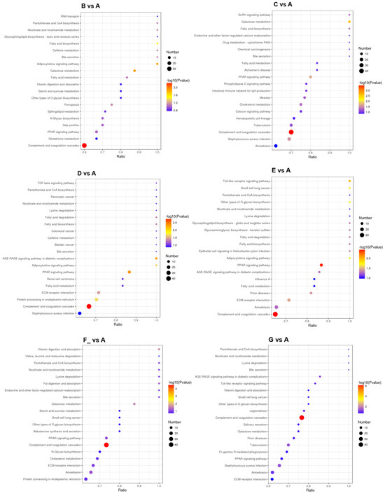 The top 20 main metabolic pathways associated with the DEPs are shown in Figure 6. Take B vs. A, for example. Metabolic pathway analysis showed that most down-regulated DEPs were related to complement and coagulation cascades, and up-regulated DEPs were involved in galactose metabolism, the adipocytokine signaling pathway, and fatty acid biosynthesis (Table 5).