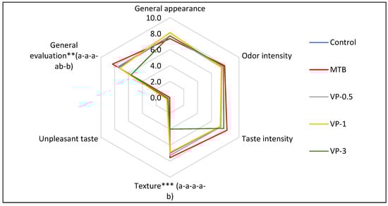 Sensory evaluation of different cooked burgers. ** p < 0.01 *** p < 0.001. Different letters (a-b) indicate significant differences in the Tukey test. Control (burgers manufactured without sodium metabisulphite); MTB (burgers manufactured with sodium metabisulphite); VP-0.5 (burgers manufactured with 0.5% (w/w) valorized white wine pomace); VP-1 (burgers manufactured with 1% (w/w) valorized white wine pomace); VP-3 (burgers manufactured with 3% (w/w) valorized white wine pomace).
