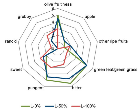 Among the positive olfactory characteristics of the VOOs, the intensity of “other ripe fruits” increased in oils from infested fruits (L-50% and L-100%), while the intensity of “olive fruitiness”, “apple” and “green leaf/green grass” decreased, especially in L-100%. The taste characteristics bitterness and pungency also showed a decreasing trend, especially in the case of L-100% VOOs. Bitterness and pungency are mainly related to the phenolic compounds of the olive oil [38]. Notario et al. [19] reported that the phenolic compound content of oils obtained from olive fly-infested fruits decreased as part of a biological response to stress following pathogen infestation. A decrease in the positive VOO sensory characteristics as a consequence of different olive fly infestation levels was also observed in previous studies on other cultivars [17,18,21,22].