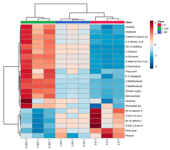 Clustering of virgin olive oils from fruits of the Leccino (L) cultivar with different levels of olive fly infestation (L-0: 0% infestation; L-50: 50% infestation; L-100: 100% infestation) according to hierarchical cluster analysis (HCA) based on the composition of selected volatile compounds as variables. The rows in the heatmap diagram represent volatile compounds and the columns represent samples. The sample codes were formed according to the following principle: Leccino (L) olive oil from olives with 0% (0) olive fruit fly infestation in the first replicate (1) was coded as L-0-1 and so on. The colours of the heatmap cells indicate low (dark blue), medium (white), and high (dark red) abundance of a particular volatile compound.