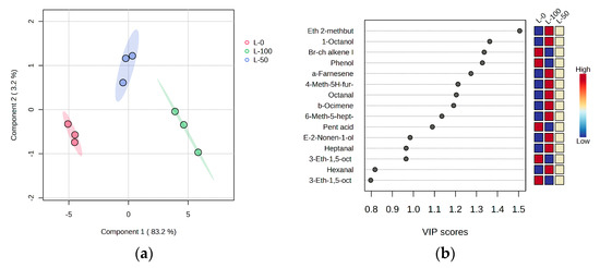 (a) Separation of virgin olive oils from fruits of the Leccino (L) cultivar with different levels of olive fly infestation (L-0: 0% infestation; L-50: 50% infestation; L-100: 100% infestation) in two-dimensional space according to partial least squares discriminant analysis (PLS−DA); (b) variable importance in projection (VIP) scores of selected volatile compounds as variables most useful for the separation.