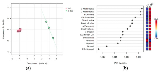 (a) Separation of virgin olive oils from fruits of the Leccino (L) cultivar with different levels of olive fly infestation (L-0: 0% infestation; L-100: 100% infestation) in two-dimensional space according to partial least squares discriminant analysis (PLS−DA); (b) variable importance in projection (VIP) scores of selected volatile compounds as variables most useful for the separation.