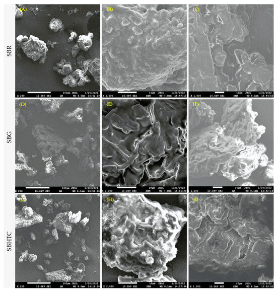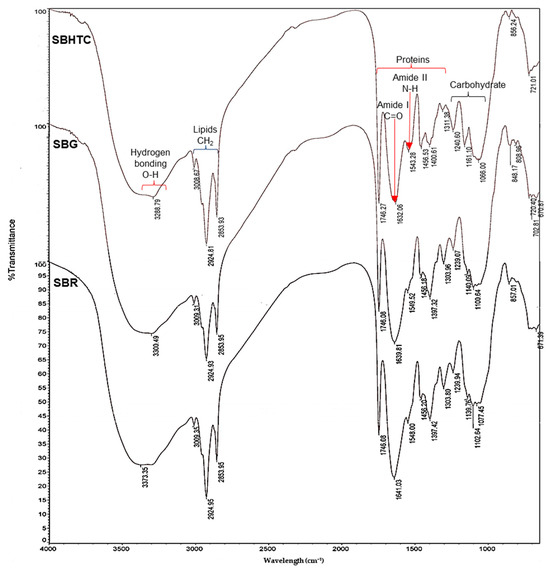 Figure 1 depicts the spectra of FTIR for the flour obtained from SBR, SBG, and SBHTC across the spectral region spanning 500 to 4000 cm−1.
