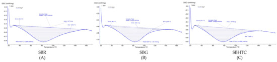 The gelatinization properties of SBR, SBG, and SBHTC flour, including onset temperature (T0), peak temperature (TP), conclusion temperature (TC), temperature range (TC-T0), and gelatinization enthalpy, are depicted in Figure 2. These gelatinization properties were significantly impacted by processing methods such as germination and hydrothermal treatment.
