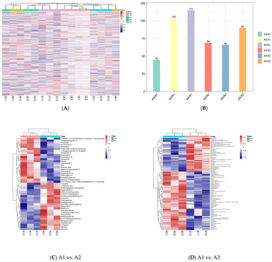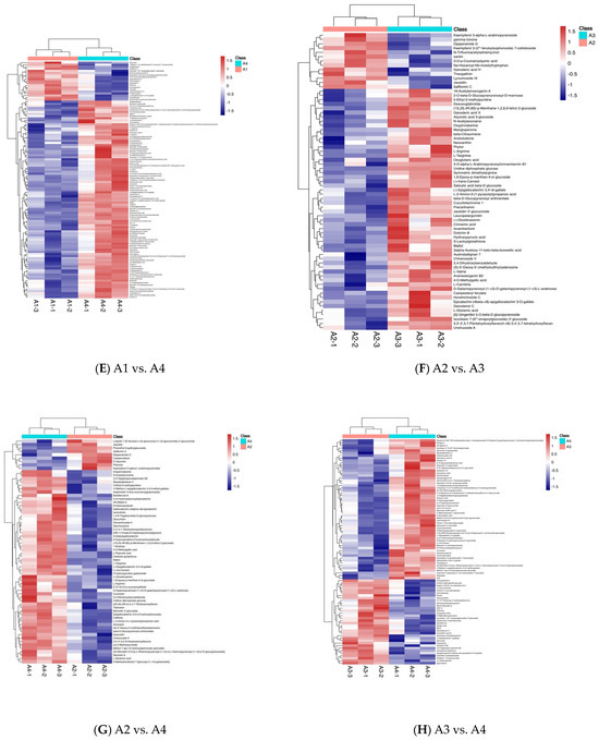 The relative content of some metabolites above A1 was higher than that of A3, as shown in Figure 1D, such as for rhoifolin, hovenoside D, hesperidin, ceposide D, kaempferol 3-arabinofuranoside 7-rhamnofuranoside, dibuthy phthalate, (-)-epigallocatechin 3,3′-di-gallate, 6″-4-hydroxycinnamoyl)astragalin 4′-glucoside, quercetin 3-(2G-rhamnosygentiobioside), kamempferol 3-[2″-(p-coumaroyglucosyl)rhamnoside], kaempferide 5-glucoside-7-glucuronide, biorobin, agvasaponin D, and Congmuyenoside B. However, the relative content of some metabolites below A1 was lower than that of A3. The relative content of some metabolites above A1 was higher than that of A4, as shown in Figure 1E, such as for kaempferol 3-[2″-(p-coumaroylglucosyl)rhamnoside], hovenoside D, ceposide D, theaflavate A, oolongtheanin, (-)-epigallocatechin-3,3′–di–gallate, and orientaloside. However, the relative content of some metabolites below A1 was lower than that of A4.