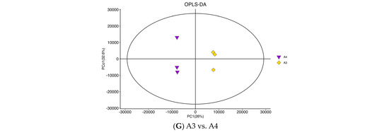 The relative content of some metabolites above A3 was higher than that of A4, as shown in Figure 1H, such as for anhydrocinnzeylanine, epigallocatechin–(4beta–>8)–epicatechin 3-O-gallate, 3,3′–Digalloylprocyanidin B2, (-)-epiafzelechin 3-gallate, (+)–gallocatechin, oolongtheanin, (-)-trans-carveol, uridine diphosphate glucose, oridine 5′–monophosphate, orientaloside, dehydrophytosphingosine, pSF–A, delphinidin 3–sambubioside, glutathione, ellagic acid, schizotenuin F, isomelitric acid A, cyanidin 3-sambubioside, 5′-Methylthioadenosine, and isovitexin 7-(6‴-sinapoylglucoside) 4′-glucoside. However, the relative content of some metabolites below A3 was lower than that of A4.