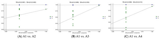 OPLS-DA is a supervised multivariate statistical analysis method that can effectively screen out differential metabolites [26]. OPLS-DA is a good method to identify the differential metabolites of Xihu Longjing tea made using different processes. The predictability (Q2) and goodness of fit (R2) of OPLS-DA models were observed for comparisons between A1 and A2 (Q2 = 0.462, R2 = 0.991, Figure 3A), as well as between A1 and A3 (Q2 = 0.253, R2 = 0.989, Figure 3B), A1 and A4 (Q2 = 0.212, R2 = 0.996, Figure 3C), A2 and A3 (Q2 = 0.392, R2 = 0.997, Figure 3D), A2 and A4 (Q2 = 0.412, R2 = 0.993, Figure 3E), and A3 and A4 (Q2 = 0.536, R2 = 0.995, Figure 3F). In the OPLS-DA models, the A1 and A2 samples, A2 and A4 samples, and A3 and A4 samples are clearly separated (Figure 3). The predictability (Q2) is good. The goodness of fit is strong.