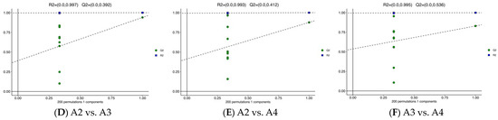 OPLS-DA of the relative differences in the metabolites in the four Xihu Longjing tea samples. (A): OPLS-DA models in A1 vs. A2; (B): OPLS-DA models in A1 vs. A3; (C): OPLS-DA models in A1 vs. A4; (D): OPLS-DA models in A2 vs. A3; (E): OPLS-DA models in A2 vs. A4; (F): OPLS-DA models in A3 vs. A4.
