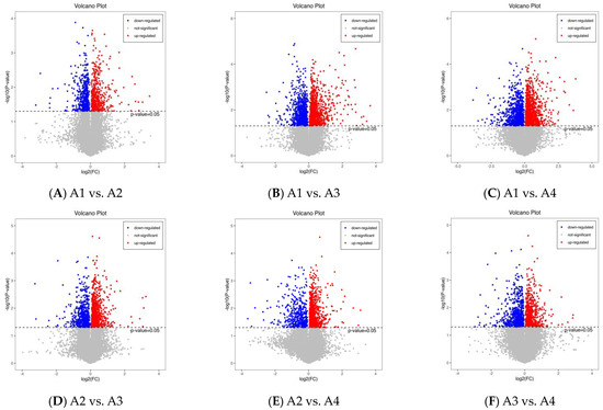 Fold change and VIP score were used to screen for differential metabolites from 490 metabolites. p > 0.5 and VIP > 1.5 are the criteria for significant differences. The results are illustrated using volcano plots (Figure 4A–F). There are 401 differential metabolites (172 up-regulated and 229 down-regulated) between A1 and A2 (Figure 4A); 340 (up-regulated 204 and 136 down-regulated) between A1 and A3 (Figure 5B); and 261 (163 up-regulated and 98 down-regulated) between A1 and A4 (Figure 4C). Similarly, there are 319 (219 up-regulated and 100 down-regulated) between A2 and A3 (Figure 4D); 332 (237 up-regulated and 95 down-regulated) between A2 and A4 (Figure 4E), and 357 (204 up-regulated and 153 down-regulated) between A3 and A4 (Figure 4F).