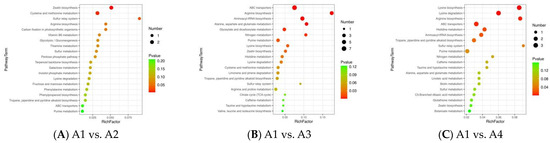 KEGG is a database for the systematic analysis of gene function and genome information that contains a lot of useful information [29]. The different metabolites of the four Xihu Longjing tea samples were mapped to the KEGG database (http://www.genome.jp/kegg/ (accessed on 8 June 2023)) to obtain detailed pathway information. The differential metabolites in the A1 and A2 samples were related to zeatin biosynthesis, L-Cysteine and methionine metabolism, and the sulfur relay system (Figure 6A). The differential metabolites in the A1 and A3 samples were related to ABC transporters, arginine biosynthesis, aminoacyl-tRNA biosynthesis, alanine, aspartate, and glutamate metabolism, nitrogen metabolism, and purine metabolism (Figure 6B). The differential metabolites in the A1 and A4 samples were related to lysine biosynthesis, lysine degradation, arginine biosynthesis, ABC transporters, histidine metabolism, aminoacyl-tRNA biosynthesis, tropane, piperidine, and pyridine alkaloid biosynthesis (Figure 6C). The results of the metabolic pathway analysis are as follows: 13/46, 28.26%, A1 vs. A2; 31/105, 29.52%, A1 vs. A3; 24/116, 20.69%, A1 vs. A4; 17/70, 24.29%, A2 vs. A3; 20/67, 29.85%, A2 vs. A4; 22/91, 24.18%, A3 vs. A4.