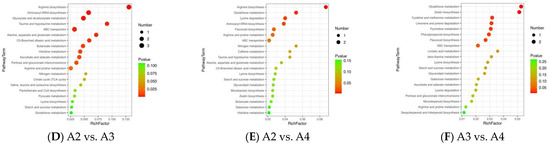 The differential metabolites in the A2 and A3 samples are related to arginine biosynthesis, aminoacyl-tRNA biosynthesis, glyoxylate and dicarboxylate metabolism, taurine and hypotaurine metabolism, ABC transporters, alanine, aspartate and glutamate metabolism, C5-Branched dibasic acid metabolism, butanoate metabolism, histidine metabolism, ascorbate and aldarate metabolism, and pentose and glucuronate interconversions (Figure 6D). The differential metabolites in the A2 and A4 samples are related to arginine biosynthesis, aminoacyl-tRNA biosynthesis, glyoxylate and dicarboxylate metabolism, taurine and hypotaurine metabolism, ABC transporters, alanine, aspartate and glutamate metabolism, C5-Branched dibasic acid metabolism, butanoate metabolism, histidine metabolism, ascorbate and aldarate metabolism, and pentose and glucuronate interconversions (Figure 6E). The differential metabolites in the A3 and A4 samples are related to arginine biosynthesis, glutathione metabolism, lysine degradation, aminoacyl-tRNA biosynthesis, flavonoid biosynthesis, arginine and proline metabolism, and ABC transporters (Figure 6F).