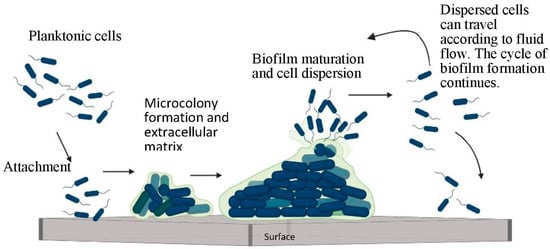 Microorganisms undertake multiple steps to form biofilms, such as initial attachment, microcolony formation, maturation, and dispersion [1], as shown in Figure 1. The initial contact of the bacteria with a substrate is reversible. Multiple physical and chemical forces, such as electrostatic and cohesive forces, play a vital role at this stage. The appendage structures, like the fimbria and pili, present on the cell membrane strengthen the bacteria–surface attachment. After getting attached to the surface, the bacteria start to divide and multiply. During this developmental stage, extracellular matrix formation takes place [6]. This matrix encompasses an extracellular polysaccharide substance (EPS) and structural proteins, among other components, which keep the colony safe from external variables, and this phase is called “irreversible attachment” [1]. Microcolonies form during this irreversible stage of attachment. Microcolony formation gives rise to cell–cell communication (quorum sensing) [6,7]. Bacteria in the microcolonies use “quorum sensing” to exchange information among themselves, and this enables the EPS to modify in response to and withstand any changes in the environment (such as pH, temperature, pressure, concentration and shear stresses). Based on this communication, the bacterial behavior can become more cooperative, competitive, or mutually beneficial [8]. The formation of small channels within the microcolonies facilitates nutrient distribution among the bacteria in biofilms [5]. The last stage of biofilm formation is characterized by the natural dispersion of bacteria from existing microcolonies. When the bacteria become naturally detached from their biofilm, either as single cells or as a cluster, they seek to colonize their environment, thereby acquiring new sites in the system, and this gives rise to an even further increase in biofilm formation [9].