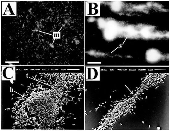 P. aeruginosa PANO67 biofilm grown under (A) laminar flow—small mound-shaped microcolonies (m) and single cells; (B) turbulent flow—filamentous streamers (s); (C,D) “head” and “tail” of a P. aeruginosa PANO67 biofilm grown under turbulent flow conditions. The direction of flow is from the bottom left to the upper right (adapted from [25]).