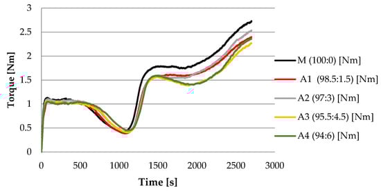 Table 4 displays the outcomes of the Mixolab device’s analysis of the flour mixtures’ rheological characteristics, compared to the control sample, M, of WF, using the rheological parameters that were found in the Mixolab Chopin+ protocol for (ICC Standard 173) [].