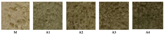 The baked goods produced under these circumstances have a limited volume and a compact texture. The sensory examinations of the panelists concluded that sample A1 (1.5% algae flour) was close to many of the characteristics of the control sample, M (WF type 650). For sample A2 (3% algae flour), the panelists concluded that with respect to porosity, crumb crumbliness, and crumb softness, the characteristics of the sample were close to those of the control sample M.