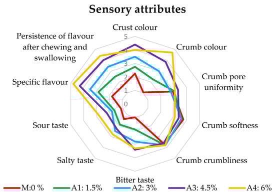 Samples A3 (purple color) and A4 (orange color) (bread obtained from the mixture of wheat flour with 4.5% algae flour and 6% algae flour) scored much less favorably than the control sample M (Figure 3).