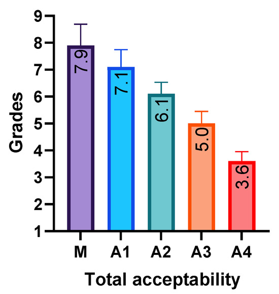 For the hedonic scale method, the consumer acceptability was determined on a 9-point hedonic scale, with 60 untrained panelists aged between 18 and 65 (60% females and 40% males). The panelists were chosen based on good health condition [,]. All bread samples of flour mixtures A1–A4 were compared to control samples, M.