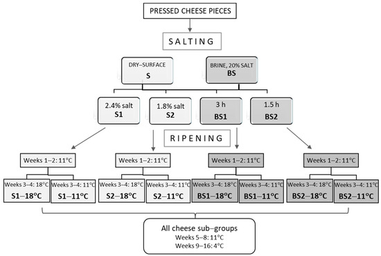 The standardized cheese milk was pasteurized at 68 °C for 10 min, immediately cooled down at 32 °C and inoculated with the commercial starter CHOOSIT AlpD (Danisco, DuPont Nutrition & Biosciences, Copenhagen, Denmark). The starter was a mixture of Lactococcus lactis subsp. lactis, Lactococcus lactis subsp. cremoris, Lactococcus lactis subsp. lactis biovar. diacetylactis, Streptococcus thermophilus, Lactobacillus helveticus and Lactobacillus lactis. After five minutes, the commercial rennet powder Naturen Extra 1125 NB (Chr. Hansen, Hørsholm, Denmark) was added at a ratio of 4 g per 100 kg milk. Cheese curdling was performed at 32 °C within 36.2 ± 2.1 min after the addition of rennet and then the cheese curd was cut into cubes with an edge of 1–1.2 cm. After stirring the cheese curd pieces for 15 min at 35 °C, a part of whey was removed and replaced by water heated at 50 °C. Then, scalding was carried out up to 38 °C for 30 min. Curd was collected into rectangular molds with the aid of cheesecloths and was pressed for 40 min, applying a weight equal to curd weight. The pressed curd was cut into cheese pieces of approximately 12 × 11 × 5 cm that were held overnight at 11 °C. Thereafter, different salting and ripening conditions were applied as summarized in Figure 1.