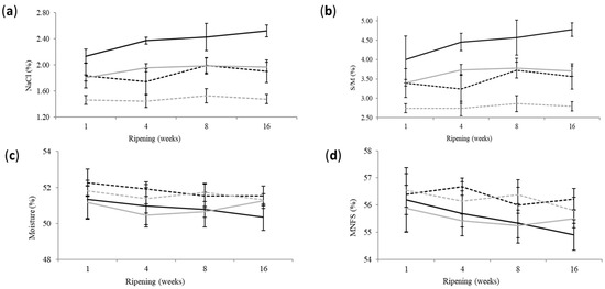 The gross composition of cheese was affected significantly by the ripening time but not by the ripening temperature scheme. The ripening time decreased moisture, MNFS, fat, FDM, protein and PDM contents and increased salt and S/M contents and P/F ratio. Most of the significant differences (p < 0.05) were observed in the interval between week 1 and week 4, whereas no significant differences were found thereafter up to week 16. The evolution of salt and S/M contents (Table 1, Figure 2) followed the evolution of moisture. A significant increase was (p < 0.05) observed at week 8, without any significant changes thereafter. Interestingly, moisture change was very limited, i.e., 0.5%, due to the fact that cheese ripened under packaging. The retention of moisture is a major aspect of the manufacture of reduced-fat cheese [3,4,5,6,7].