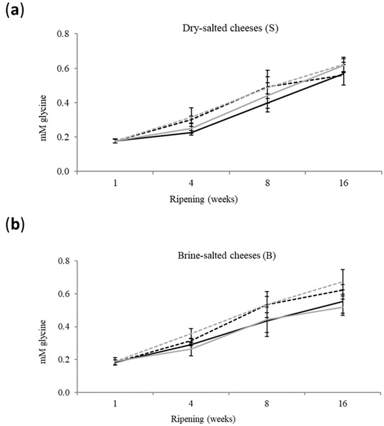 Evolution of proteolysis expressed as free amino groups (mM glycine) of dry-salted (a) and brine-salted (b) during the ripening and storage of reduced-fat sheep milk cheese. Error bars: standard deviation. Black-solid line: control-salt cheese ripened at 11 °C at the 3rd and 4th week; Black-dashed line: control-salt cheese ripened at 18 °C at the 3rd and 4th week; Gray-solid line: reduced-salt cheese ripened at 11 °C at the 3rd and 4th week; Gray-dashed line: reduced-salt cheese ripened at 18 °C at the 3rd and 4th week.
