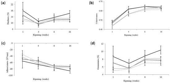 Evolution of textural parameters during the ripening and storage of reduced-fat sheep milk cheese. (a) Hardness, (b) cohesiveness, (c) adhesiveness, and (d) gumminess. Error bars: standard deviation. Black-solid line: dry-salted control-salt cheese (S1); Black-dashed line: dry-salted reduced-salt cheese (S2); Gray-solid line: brine-salted control-salt cheese (BS1); Gray-dashed line: brine-salted reduced-salt cheese (BS2).