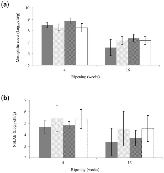 Evolution of counts of mesophilic cocci (a) and non-starter lactic acid bacteria (NSLAB) (b) during the ripening and storage of reduced-fat sheep milk cheese. Error bars: standard deviation.