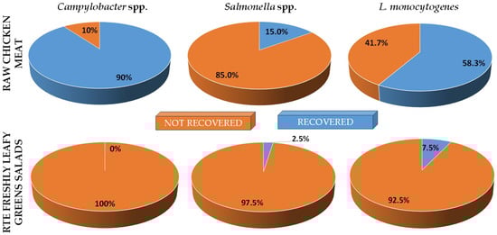 Overall prevalences (%) of Campylobacter spp., Salmonella spp., and L. monocytogenes in retail raw chicken meat and RTE fresh leafy greens salads collected from retail outlets in Myrina (Lemnos Island, Greece). The blue portions indicate the percentages of the pathogen-positive samples, whereas the dark orange portions indicate the percentages of the pathogen-negative samples.