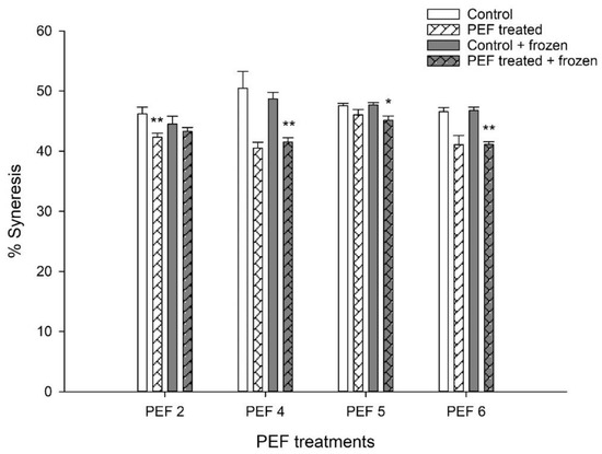Effect of PEF pre-treatment of starter cultures on the syneresis of set yogurt. Yogurts were made with freshly PEF-pre-treated cultures (PEFx-D) or with cultures which were flash-frozen and stored at −20 °C for 14 days after PEF pre-treatment (PEFx-FF). PEF2, PEF4, PEF5 and PEF6 represent different PEF parameters. The bars indicate the mean values of three independent experiments ±1 standard deviation. * p < 0.1, ** p < 0.05 (paired t-test) compared with the respective controls (control vs. PEF-treated; control + frozen vs. PEF-treated + frozen).