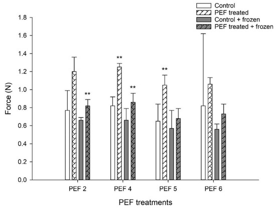 Effect of PEF pre-treatment of the starter culture on the stiffness of set yogurt. Force (N) is the maximum force applied on the surface of the yogurt until the first break. Yogurts were made with freshly PEF-pre-treated cultures (PEFx-D) or with cultures which were flash-frozen and stored at −20 °C for 14 days after PEF pre-treatment (PEFx-FF). PEF2, PEF4, PEF5 and PEF6 represent different PEF parameters. The bars indicate the mean values of three independent experiments ± 1 standard deviation. ** p < 0.05 (paired t-test) compared with the respective control (control vs. PEF-treated; control + frozen vs. PEF-treated + frozen).