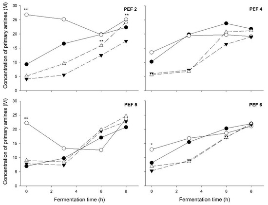 Proteolytic activity at different time points of yogurt fermentation made with differently PEF-treated starter cultures (PEF 2, PEF 4, PEF 5, PEF 6). ●: control; ○: PEF-treated; ▼: control + frozen; △: PEF-treated + frozen. Significant difference to the respective control (control vs. PEF-treated; control + frozen vs. PEF-treated + frozen; paired t-test), *: p < 0.1; **: p < 0.05. Error bars were removed for clarity.