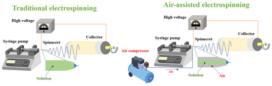 A schematic illustration of traditional electrospinning and air-assisted electrospinning is shown in Figure 1. To transfer each solution to the needle tip (with an inner diameter of 0.5 mm), a 10 mL syringe was used and pushed through the pressure pump at a rate of 10.0 mL/h for air-assisted electrospinning and a rate of 1.0 mL/h for traditional electrospinning. To create a high-voltage direct-current (DC) electric field, a high-voltage power generator was employed. Air pumps were then used to maintain a 400 L/h airflow rate. With a tip-to-collector distance of 15 cm, the electrospinning voltage was adjusted to 18 kV.