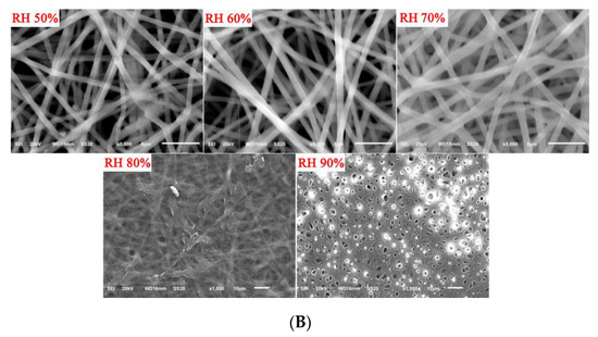 (A) SEM images and fiber diameter distributions of the gelatin/zein/glucose nanofibers fabricated by traditional electrospinning and air-assisted electrospinning (values with different superscript letters are significantly different, p < 0.05). (B) SEM images of gelatin/zein/glucose nanofibers prepared at 60 °C and 50–90% RH for 24 h.