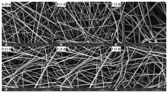 Morphologies of gelatin/zein/glucose nanofiber films after Maillard reactions conducted at 60 °C and 50% RH for 0 (A), 1 (B), 2 (C), 3 (D), 4 (E), and 5 days (F).